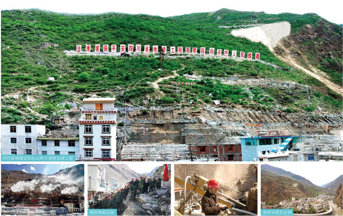 2005年1月,甘孜州丹巴縣城建設街后山特大滑坡(225萬方)突發變形,其變形速度之大、危害之嚴重、應急治理難度之大屬國內罕見。滑坡直接威脅丹巴縣城存亡。川勘集團臨危受命,大膽創新,制定出“前緣堆載、滑坡體實施錨索、框格梁鎖住滑坡”的科學治滑方案,冒著生命危險,拼時間搶速度,“邊滑邊治”,最終勝利完成四川省委省政府“力爭不滑坡、確保不死人”的任務,實現了滑坡治理史上的一個世界性創舉。