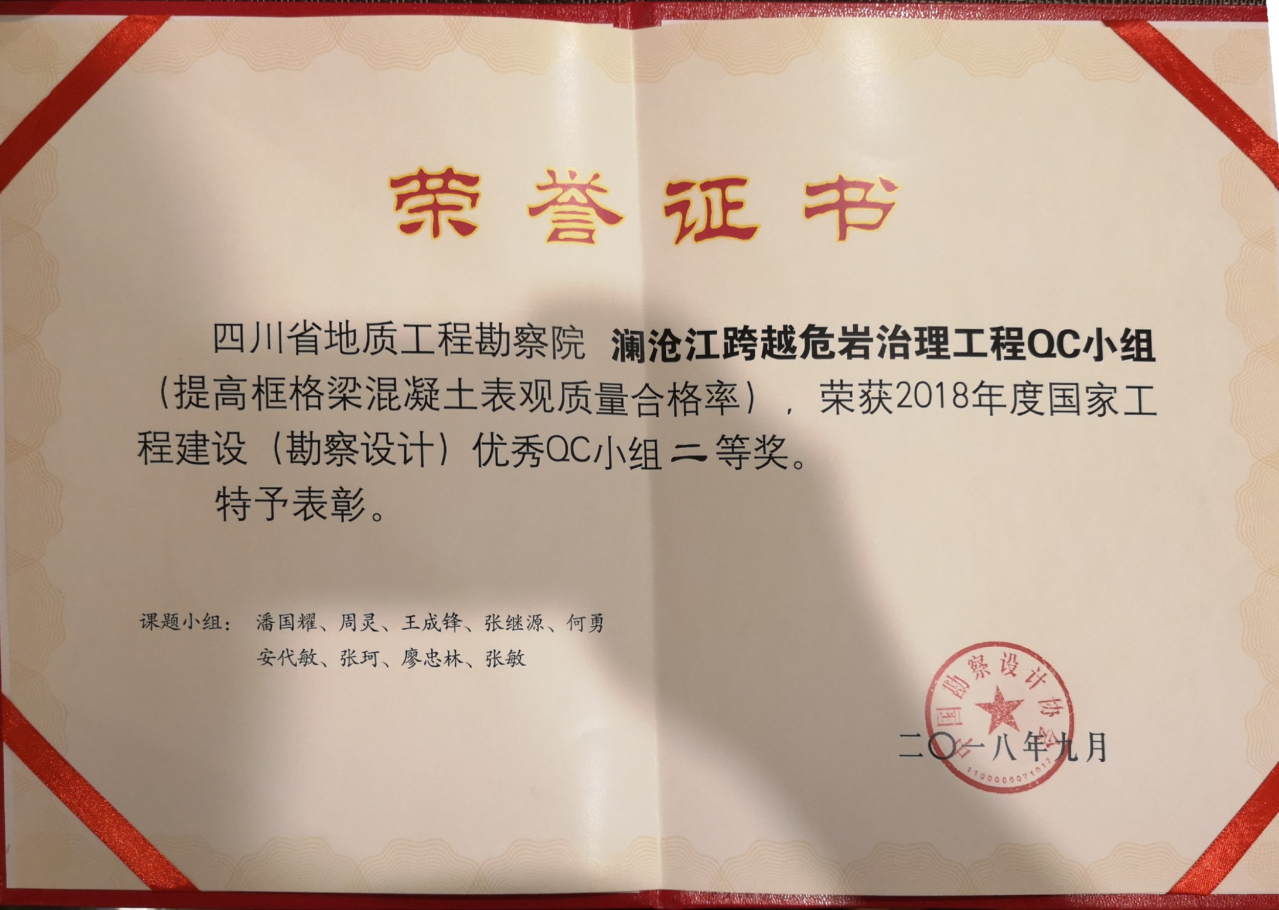 近日,我院瀾滄江跨越危巖治理QC小組在2018年度國家工程建設(shè)(勘察設(shè)計)優(yōu)秀質(zhì)量管理(QC)小組評選會上榮膺二等獎。這是繼2004年我院“資陽市雁江區(qū)紅層找水打井項目”榮獲QC一等獎之后時隔十五年獲得的第二個國家級QC獎項。